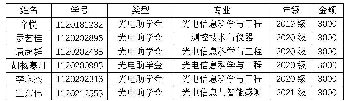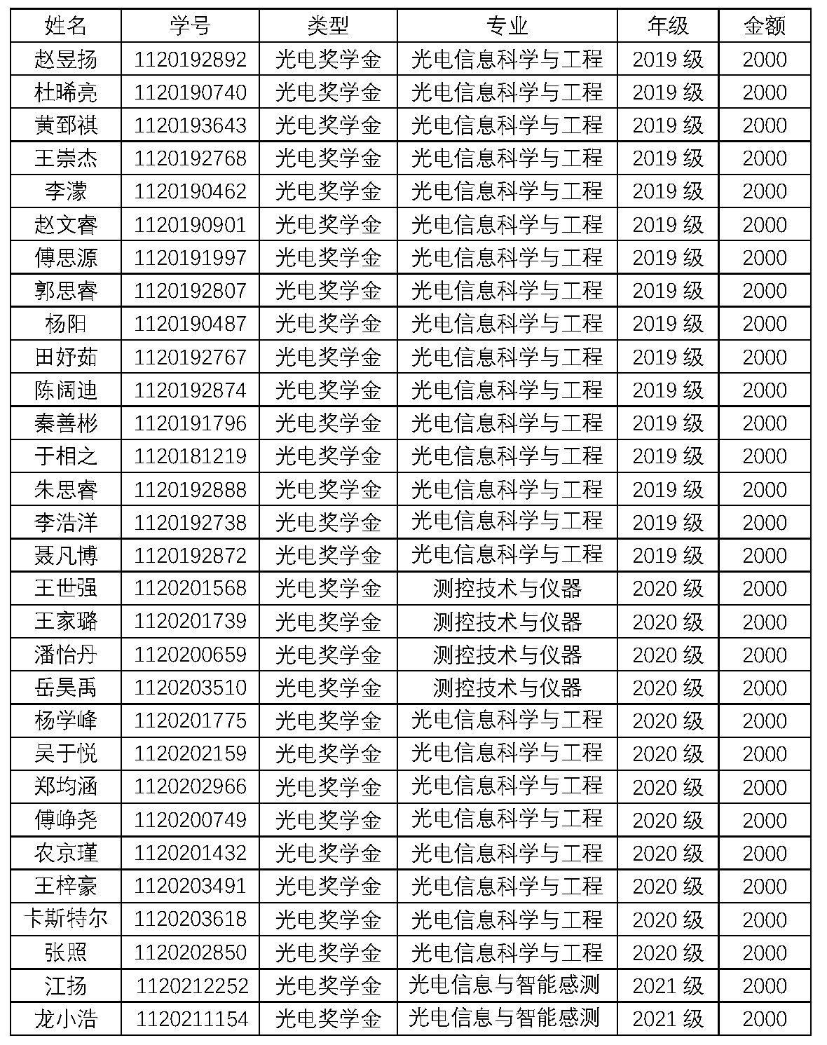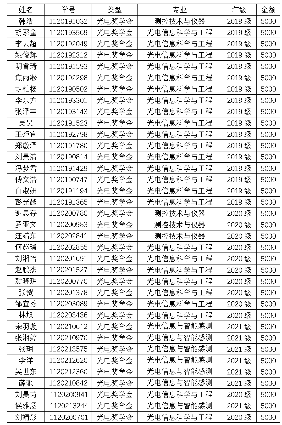 经光电奖助学金评审委员会讨论通过,光电奖学金有123人入围,其中一等奖36名,二等奖57名,三等奖30名;光电助学金6人入围。光电奖学金不和国家奖学金以及其他社会捐助奖学金兼得,评选年度无不合格课程记录。光电助学金不和国家励志奖学金、以及其他社会捐助奖学金等兼得。经2月20日-2月24日公示之后,现将最终评定结果通知如下: