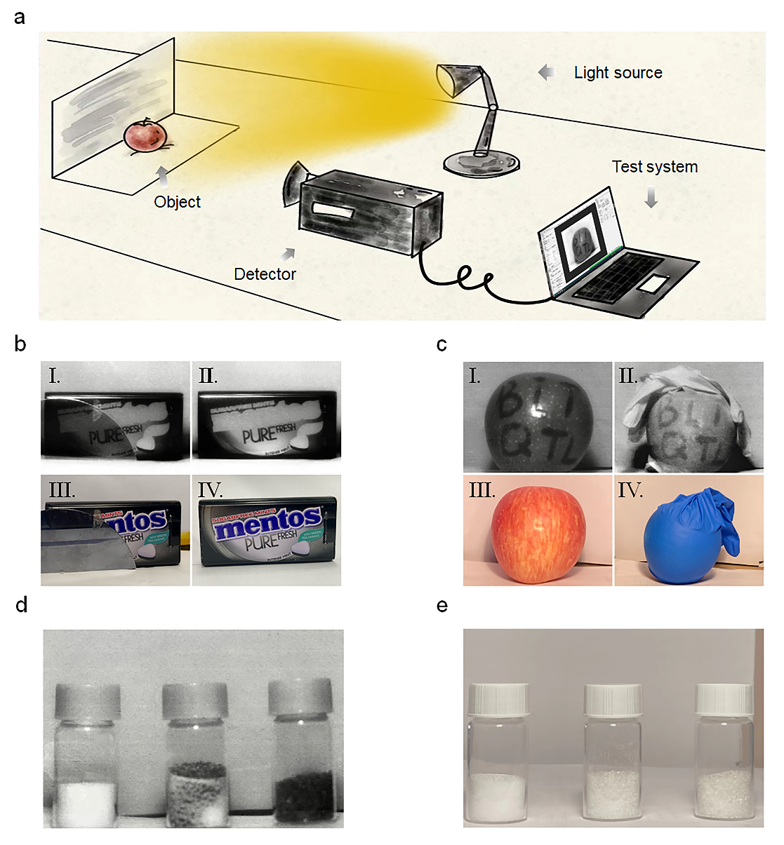 图4 短波红外成像:(a)成像过程示意图。(b)曼妥思糖盒和糖盒前面的硅片、(c)表面有 “BITQTL”字样的苹果和丁腈手套内的苹果、(d)盐、盐和糖的混合物及糖的可见光和短波红外成像图。