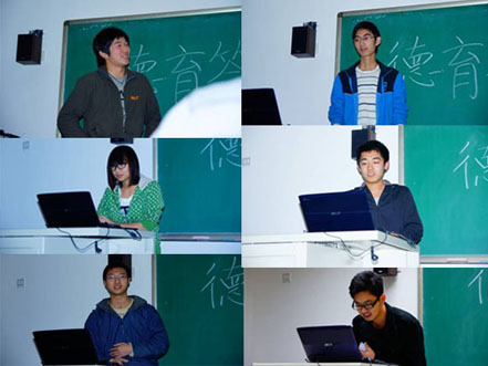 参加此次报告会有班主任张海洋老师、2009级辅导员盛筠老师。报告会在班长耿仲博的主持下开始。首先我们回顾了班级在过去个两年里的点点滴滴,对德育开题的实现情况,然后每个同学依次上台进行自己的检查陈述,接着由辅导员,班主任及全体同学对上台同学的现场答辩表现进行打分。
