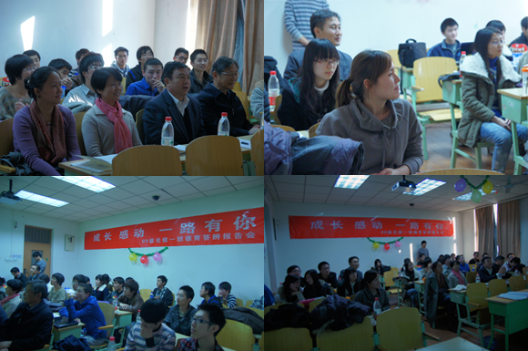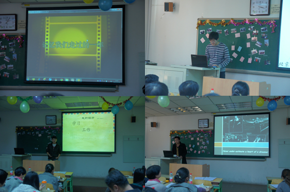 紧接着,同学们开始演讲,报告会进入正题。答辩以前一位同学随机抽取下一位同学卡片的形式进行。由学习委员王雪娇同学开始,她以图文并茂的演说让我们了解到了她这两年来充实的生活。随后,上台的每位同学都以ppt结合演说的形式回顾了两年的老员工活,并展望未来。有的同学叙述了自己从自卑到建立自信的过程;有的回顾了自己两年中社团社会活动的经历;有的则讲述了自己从入学时的迷茫渐渐确立目标的过程,并向自己理想的生活不断迈进……演讲其间,余佩锋同学还为大家献上自己准备的歌曲《The River》,寓意即我们每个人都是河流中的一叶扁舟,河流承载着我们的理想,希望大家能不断探寻自己的梦。在生动活泼的汇报中,大家更深入地互相了解,增进了感情。