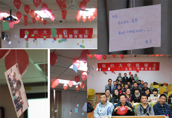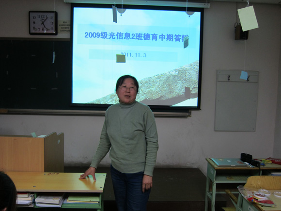 德育答辩当天,班主任徐丽老师、08级光电专业辅导员汤琪老师、09级光电专业辅导员盛筠老师认真听取了同学们充满激情、诙谐机智的答辩,并就同学们的答辩提出了具有深刻内涵的启发性问题,同时对个别同学的困惑给予了充满智慧的建议。会后,班主任徐老师对同学们提出了真诚的寄语“愿同学们把理想付诸实践,增强班级凝聚力,营造积极向上的班风学风;同时把自己塑造成德才兼备的新时代人才。”辅导员盛筠老师也语重心长地教育我们“要强化学习意识的培养,注意选择人生道路方向的重要性;多学习社会经验,拓宽眼界;多方面多角度的看待自己,发掘自己巨大的潜力。”最后盛老师将科比布莱恩的名言赠送给我们:You can do anything you want,if you really want it.