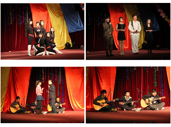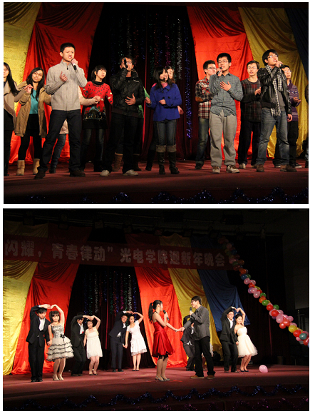 作为304am永利集团官方首届新年晚会,本次文艺汇演融合了现代舞、教师民族歌舞、歌曲串烧、小品、舞台剧、蒙古歌舞和丰富精彩的游戏环节等等。大一新生的小品诙谐中阐述了90后对老员工活的认真解读;吉他乐队的洒脱和歌曲联唱的清丽展现了光电学子的多才多艺;盛筠和姜曼老师的轻歌曼舞更是将晚会推上了一个高潮。